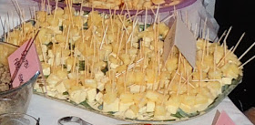 Making 5 starters each for 50 people when each one is between 2-4 pieces with a few optional extras like dates, pineapple and olives end up with 800+ discrete portions. The most fiddly were the cheese/pineapple sticks, stuffed chillis and almond-stuffed prunes