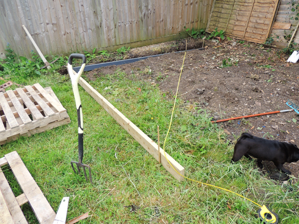 The ground was quite uneven with about a foot difference in ground height, so it required a fair amount of levelling to get the ground flat. the yellow line is a tape measure used to measure out the correct length for a square frame, using Pythagoras's theorem (square on the hypotenuse, etc...)